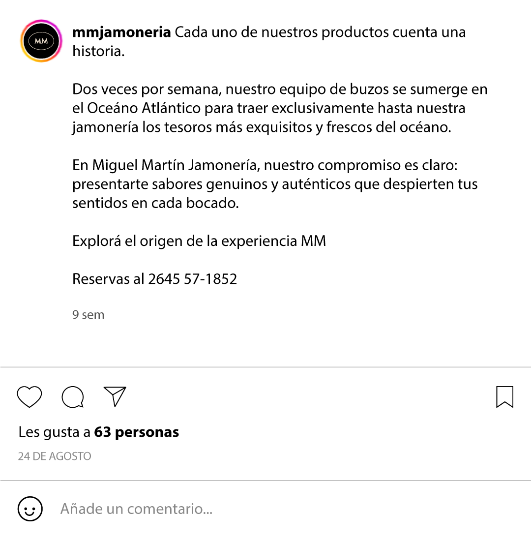 Miguel Martín Jamonería es un local gastronómico caracterizado por brindar una experiencia culinaria única, basada en la cocina mediterránea, y pensada para todo el país. Comenzamos a trabajar juntos en el año 2020. Desde su rebranding, aplicación en local y publicidad on y offline. En sus redes sociales los objetivos a largo plazo fueron: elevar la marca, atraer público de más 30 años, difundir su gastronomía gourmet única en la provincia y reforzar la imagen de Miguel Martín como chef y cabeza de este proyecto. Creamos un manual de marca con estilos comunicativos, gestión de campañas publicitarias, redacción de copies, contacto con influencers, medición de resultados y gestión de medios masivos de comunicación fueron algunas de las estrategias para que este desafío que representa la marca de MM Jamonería se convirtiese en lo que los dueños alguna vez soñaron.